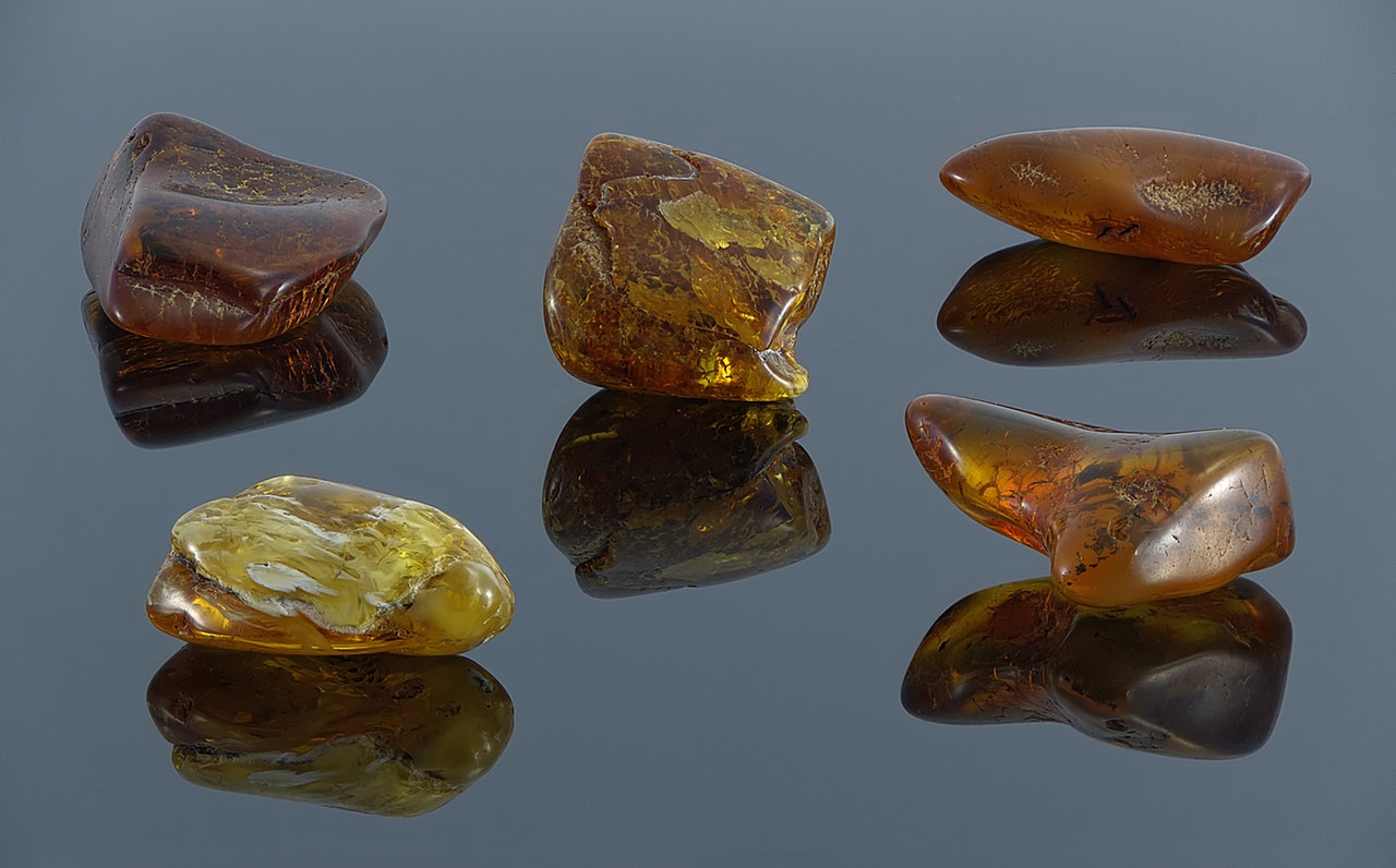 Five differnt subsets of amber stones showcasing the historical progress of amber stones